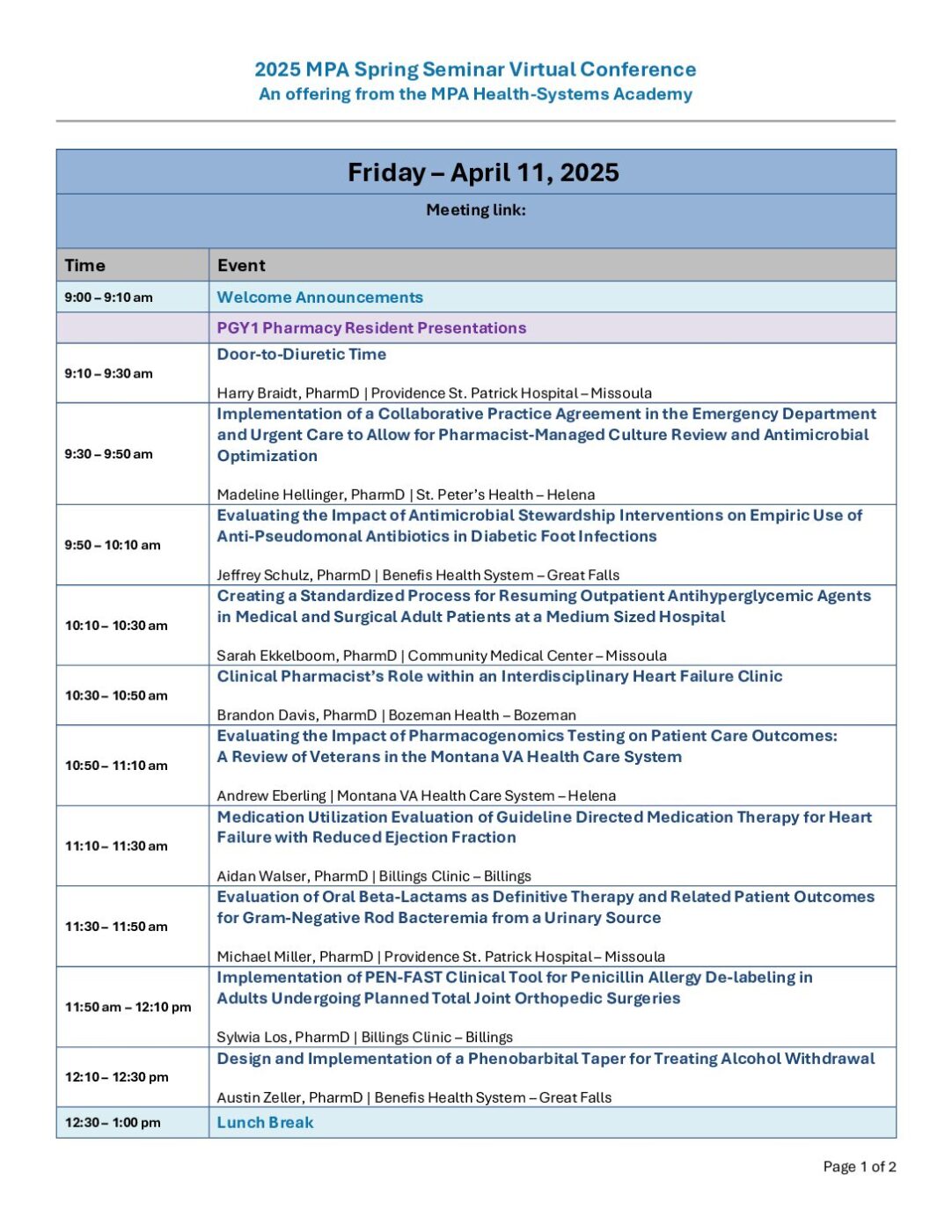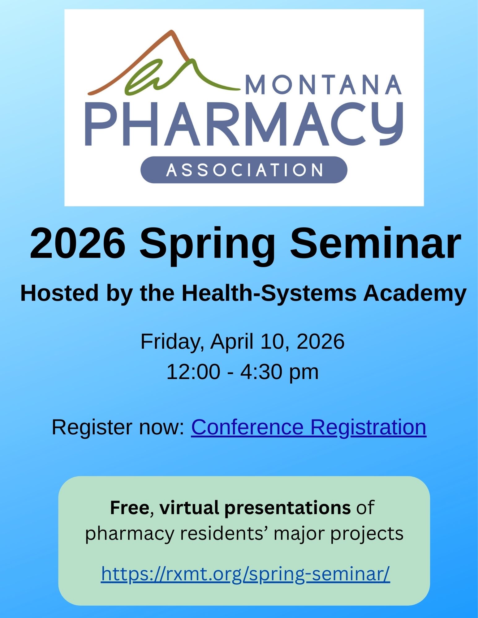 Each year, MPA and the Health-Systems Academy host the annual Spring Seminar. This is a free, virtual, non-CE conference of the Montana pharmacy residents’ major projects. This year, it will take place via Zoom on Friday, April 10, 2026.
